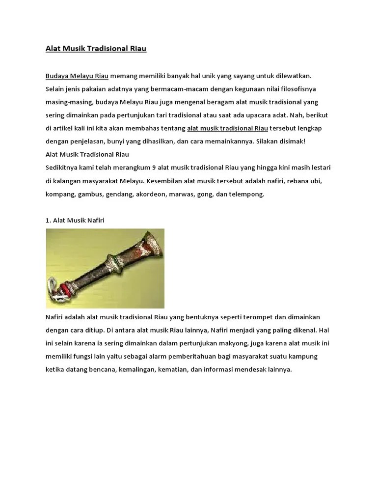 Alat musik rebana ubi ini merupakan alat musik perkusi yang digolongkan sebagai gendang. Alat musik gambus riau adalah hasil kontak budaya melayu dengan islam melalui gambus arab (al oud), sehingga disebut gambus melayu riau. Nafiri merupakan alat musik tradisional yang berasal dari provinsi riau di pulau sumatra yang bentuknya mirip dengan terompet. Alat musik rebana ubi ini merupakan alat musik perkusi yang . Genggong talang mamak · 6.