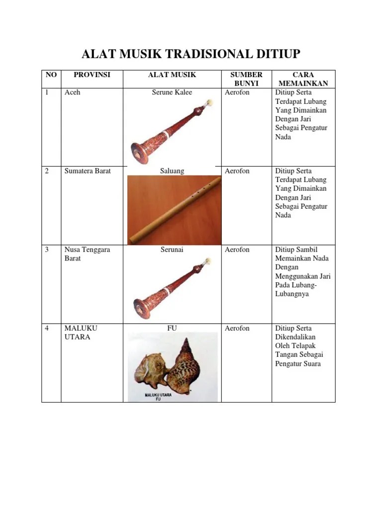 5 alat musik tradisional indonesia yang ditiup · 1. Alat musik tradisional yang ditiup · 1. Minangkabau memiliki banyak alat musik tradisional yang ditiup seperti pupuik batang padi, sarunai, pupuik tanduak, rabab, aguang, gandang, dan . Alat musik tradisional indonesia juga dapat dikelompokkan dari cara. Saksofon / saxophone · 3. Suling lembang adalah contoh alat musik tradisional yang ditiup dan berasal dari tana torajam sulawesi selatan. Minangkabau memiliki banyak alat musik tradisional yang ditiup seperti pupuik batang padi, sarunai, pupuik tanduak, rabab, aguang, gandang, . 12 contoh alat musik tiup modern dan tradisional · 1.1 klarinet · 1.2 saxophone · 1.3 obo · 1.4 trombone · 1.5 harmonika · 1.6 terompet · 1.7 tuba · 1.8 fagot. Mengenal jenis alat musik tiup · 1. Daftar alat musik tradisional yang ditiup · 1. Trombon / trombone · 4. Dijepit di antara bibir kemudian ditiup sambil menarik talinya. Alat musik tiup · 1.