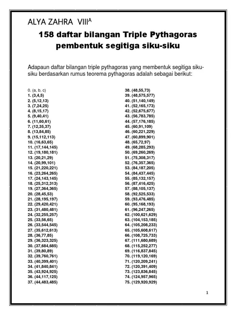 Bilangan tripel phytagoras · 3, 4, 5 · 5, 12, 13 · 7, 24, 25 · 8, 15, 17 · 9, 40, 41 · 11, 60, 61 · 12, 35, 37.