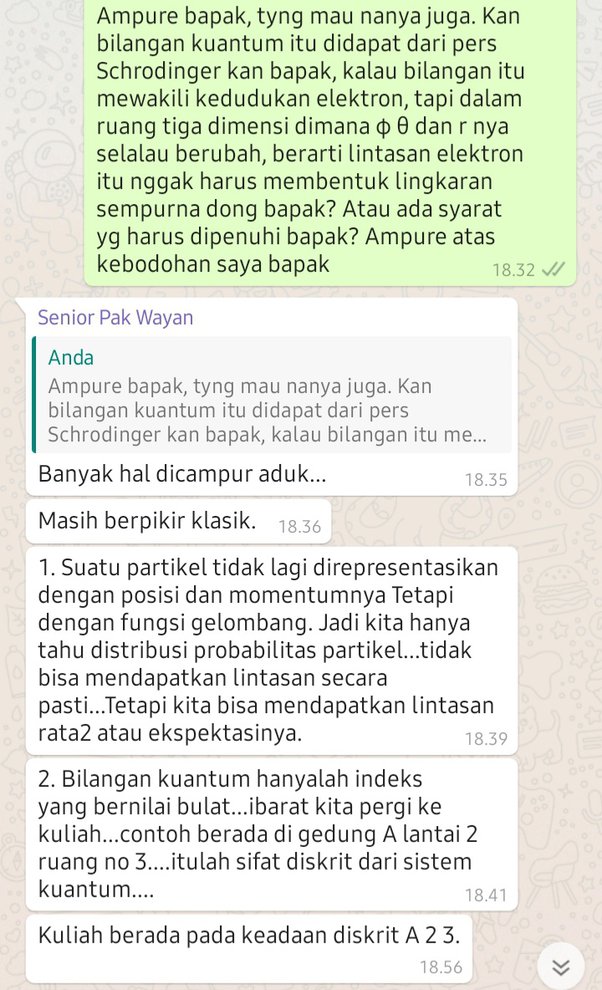 Sebelum anda memahami bab ini, anda harus faham … Ingat kembali materi tentang konfigurasi elektron dan diagram orbital. Bagaimana ya cara mencari keempat bilangan tersebut? 11/08/2012 · mungkin anda yang masih belum faham dan mengerti tentang cara menentukan bilangan kuantum utama (n), cara menentukan bilangan kuantum azimuth (l), cara menentukan bilangan kuantum magnetik (m), dan cara menentukan bilangan kuantum spin (s). 22/07/2013 · bilangan kuantum adalah suatu besaran yang berguna untuk menggambarkan posisi elektron suatu atom dan membedakannya dari elektron yang lain. Satu set bilangan kuantum terdiri dari empat bilangan. Secara khusus bilangan kuantum dapat menentukan keadaan elektron. Posisi elektron pada saat mengelilingi inti tidak dapat ditentukan secara pasti, yang bisa ditentukan adalah kebolehjadian terbesar (probabilitas) untuk menemukan elektron di sekitar inti atom. Ada empat bilangan kuantum yang menunjukan posisi atau letak kedudukan elektron dari suatu atom. Hal yang sedemikian kecilnya, yang menyusun segala sesuatu di alam ini, ternyata diatur oleh empat bilangan! 26/11/2020 · cara menentukan bilangan kuantum utama, bilangan kuantum azimut, bilangan kuantuk magnetik, dan bilangan kuantum spin pada unsur kimia 05/02/2021 · cara menentukan harga bilangan kuantum berguna untuk mengetahui letak atau kedudukan elektron dari suatu atom. Kali ini gw akan memberitahu menentukan bilangan kuantum dengan mudah, mungkin banyak para siswa sma terutama kelas 11 yang masih pada bingung dengan bilangan kuantum, nih gw kasih sedikit …