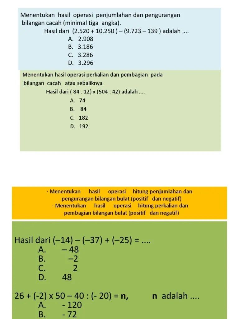 Selesaikan dengan menggunakan sifat asosiatif dan distributif! Contoh soal mengurutkan bilangan bulat dan jawabannya kelas 6. Operasi hitung campuran terdiri dari penjumlahan, pengurangan, perkalian, dan pembagian. Berikut ini contoh soal operasi hitung campuran . Pengurangan dan penjumlahan bilangan bulat.