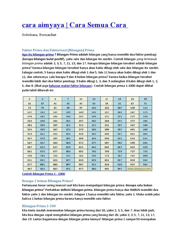 Contohnya faktorisasi prima bilangan 42 yaitu 2 x 3 x 7, dimana terdapat bilangan prima pembagi 42 seperti 2, 3, dan 7. 2, 3, 5, 7, 11, 13, 17, 19, 23, 29, 31, 37, 41, 43, 47. Faktorisasi prima merupakan bagian dari ilmu matematika yang berkaitan erat dengan bilangan prima. 08/10/2015 · bilangan prima 1 sampai 50 merupakan bilangan prima yang paling sering dipakai. Faktorisasi tunggal pada sub bab sebelumnya telah dibicarakan bahwa bilangan bulat positif yang lebih besar dari 1 terbagi oleh suatu bilangan prima, sehingga setiap bilangan.