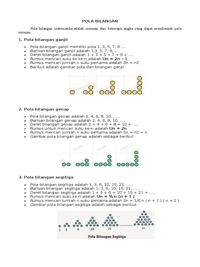 Mau belajar tentang macam macam pola bilangan? Elo bisa lihat kan bentuknya seperti persegi . Lebih tepatnya gambar pola bilangan persegi panjang. Jika dijabarkan dalam bentuk gambar, akan menjadi seperti berikut. Gambar pola bilangan ganjil :.