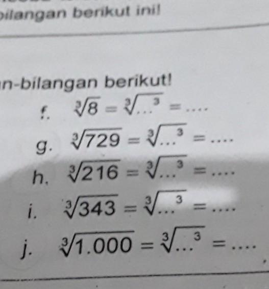 Akar pangkat tiga adalah kebalikan dari perpangkatan tiga. Sedangkan angka pertama adalah 8,. Jadi hasil akar pangkat tiga dari soal diatas, hasilnya di dapatkan dari. Perhatikan angka terakhir pada soal. Karena angka terakhir dari adalah 0, maka angka terakhir dari hasil akar pangkat tiganya adalah 0. Tentukan hasil akar pangkat tiga bilangan berikut!