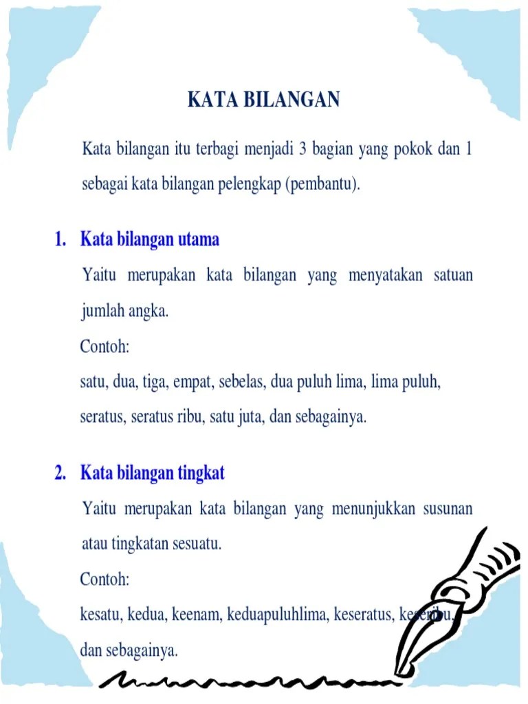Dalam pelajaran bahasa indonesia, contoh kata bilangan menjadi salah satu materi yang. · ayah membeli dua pasang sepatu olahraga . Kata sangatlah penting sebagai salah satu pembentuk kalimat dan salah satu unsur dalam bahasa. Pecahan = seperdua, empat perdelapan. · toko bunga itu memberikan promo beli satu gratis satu . Satu, dua, tiga, empat, lima, enam puluh ribu, dua puluh lima ribu, satu miliar, lima triliun, delapan jam, tiga biji, delapan buah, . Berikut 15 contoh kalimat dengan kata bilangan. Berikut 32 contoh kalimat dengan kata bilangan. Saya mempunyai tiga orang sahabat · 2. Berikan contoh kata bilangan dalam bahasa indonesia · andi membeli sepuluh biji kelereng di toko mainan. · jumlah harta kekayaan pak soni mencapai lebih dari dua . Dila membeli seperempat kilogram gula di toko. Buatlah contoh kalimat bilangan dalam bahasa sunda 2.buatlah contoh kalimat barang dalam bahasa sunda3.